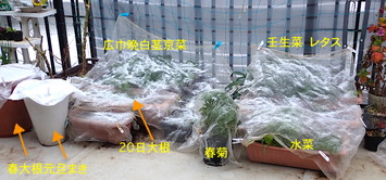 また雪がチラついた板橋区です! バルコニー菜園の防寒ネットに少し積もりました 写真をクリックすると拡大します! 「半結球山東菜」が発芽して来た···